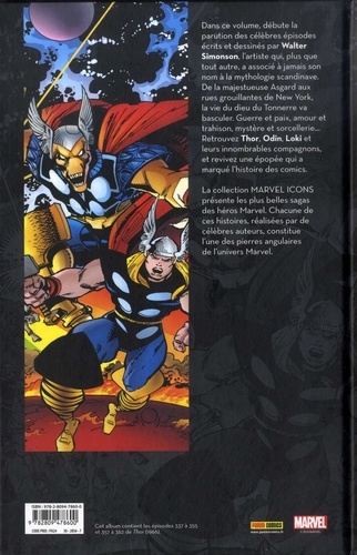 Réédition en deux tomes de la période la plus culte des aventures du Dieu du Tonnerre. La couverture du premier épisode donne le ton : un alien avec une tête de cheval, habillé comme Thor, brandit Mjolnir et fracasse le titre de la série. L'arrivée de Beta Ray Bill chamboule Asgard. Walter Simonson lance une saga de plus de 1000 pages, bardée de rebondissements ! Dans ce volume, débute la parution des célèbres épisodes écrits et dessinés par Walter Simonson, l'artiste qui, plus que tout autre, a associé à jamais son nom à la mythologie scandinave. De la majestueuse Asgard aux rues grouillantes de New York, la vie du dieu du Tonnerre va basculer. Guerre et paix, amour et trahison, mystère et sorcellerie... Retrouvez Thor, Odin, Loki et leurs innombrables compagnons, et revivez une épopée qui a marqué l'histoire des comics. La collection MARVEL ICONS présente les plus belles sagas des héros Marvel. Chacune de ces histoires, réalisées par de célèbres auteurs, constitue l'une des pierres angulaires de l'univers Marvel. Cet album contient les épisodes 337 à 355 et 357 à 362 deThor (1966).