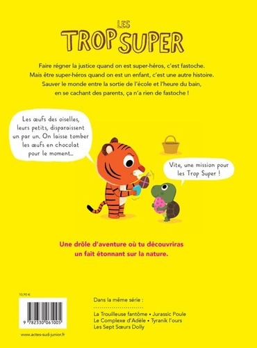 Faire régner la justice quand on est super-héros, c'est fastoche. Mais être super-héros quand on est un enfant, c'est une autre histoire. Sauver le monde entre la sortie de l'école et l'heure du bain, en se cachant des parents, ça n'a rien de fastoche ! "Les oeufs des oiselles, leurs petits, disparaissent un par un. On laisse tomber les oeufs en chocolat pour le moment..." "Vite, une mission pour les Trop Super !" Une drôle d'aventure où tu découvriras un fait étonnant sur la nature.