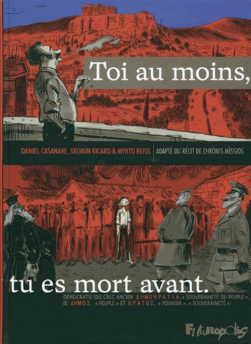 1947 : la Grèce sort de la seconde guerre mondiale pour tomber dans le chaos de la guerre civile. Chronis Missios, 17 ans, résistant communiste, est arrêté puis condamné à mort. Gracié, torturé, ballotté de prison en prison, il va devenir selon ses termes, un "prisonnier professionnel" durant 21 ans. Son histoire, Chronis Missios l'a racontée dans un livre paru en 1985 en Grèce, devenu rapidement un best-seller, Toi au moins, tu es mort avant. Subjugués par ce témoignage, Sylvain Ricard, Myrto Reiss et Daniel Casanave ont eu envie de la faire connaître par le biais de la bande dessinée. "Je n'ai pas réussi à changer le système, mais je ne lui permettrais pas non plus de me changer" disait-il. Plus que celle d'un pays, aujourd'hui des plus discrédités, plus que celle d'une idéologie, aujourd'hui devenu gros mot, l'histoire de Chronis est celle d'un engagement, d'un idéal, d'une réponse à la vacuité existentielle et la tentation néo-liberale qui nous rongent plus que jamais.