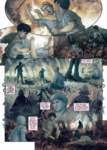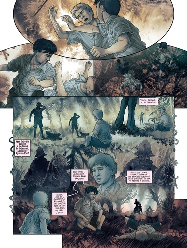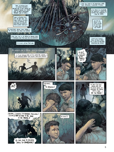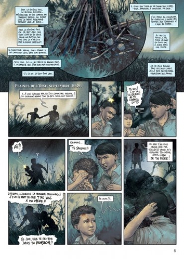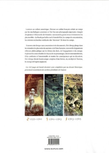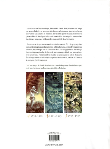 Louison un enfant amnésique, Etienne un soldat français séduit un temps par les mythologies aryennes et Yin-Tsu une photographe japonaise chargée d'espionner l'Ahnenerbe de Himmler, traversent la guerre et ses événements les plus terribles : la Shoah par balles sur le front de l'Est, les camps de concentration, les sinistres recherches médicales des "docteurs" SS dans les camps. A travers cette fresque sans concession et très documentée, Eric Liberge plonge dans les méandres les plus noirs du nazisme et de l'âme humaine, tout en développant une réflexion philosophique sur les thèmes du choix, de l'engagement et du courage. Explorant les zones d'ombre de chacun de ses personnages, loin de tout manichéisme, il les confronte à l'innommable et montre les conséquences qui en découlent. Eric Liberge déroule la mécanique complexe d'une fiction, où, en dépit de l'horreur, le courage et l'espoir surgissent. Les 162 pages de bande dessinée sont complétées par un dossier historique, présentant notamment des archives familiales de l'auteur.