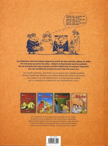 Retrouvez les Bidochon enfin en intégrale ! Robert et Raymonde Bidochon sont un couple : ils s'aiment (du moins la majeure partie du temps), vivent en France et attendent que le temps passe. C'est l'histoire d'un couple normal qui vit une vie banale. Mais c'était sans compter le génie humoristique de Binet qui va faire de ses personnages des stéréotypes de Français moyens dans toute leur médiocrité tout en les rendant très attachants. Durant 40 ans, Binet a décrit la société française à travers Les Bidochon. De la naissance de leur couple à la construction de leur maison en passant par la vie dans les H. L. M. ou les vacances organisées, cette première intégrale regroupe les quatre premiers tomes de la série qui retracent les premières années de ce couple préféré des Français.