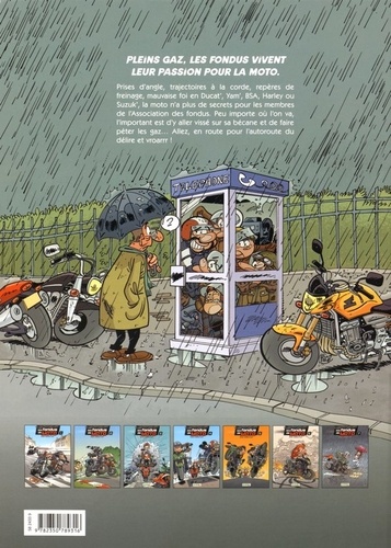Pleins gaz, les fondus vivent leur passion pour la moto. Prises d'angle, trajectoires à la corde, repères de freinage, mauvaise foi en Ducat', Yam', BSA, Harley ou Suzuk', la moto n'a plus de secrets pour les membres de l'Association des fondus. Peu importe où l'on va, l'important est d'y aller vissé sur sa bécane et de faire péter les gaz... Allez, en route pour l'autoroute du délire et vroarrr !