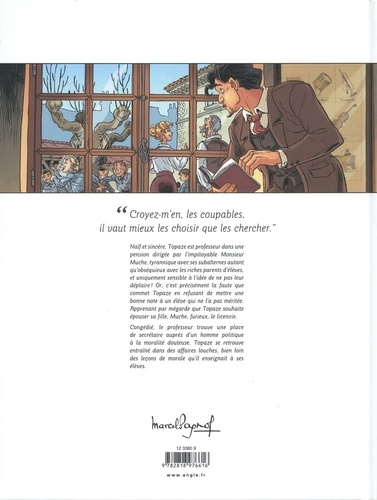 Naïf et sincère, Topaze est professeur dans une pension dirigée par l'impitoyable Monsieur Muche, tyrannique avec ses subalternes autant qu'obséquieux avec les riches parents d'élèves. et uniquement sensible à l'idée de ne pas leur déplaire ! Or, c'est précisément la faute que commet Topaze en refusant de mettre une bonne note à un élève qui ne l'a pas méritée. Apprenant par mégarde que Topaze souhaite épouser sa fille, Muche, furieux, le licencie. Congédié, le professeur trouve une place de secrétaire auprès d'un homme politique à la moralité douteuse. Topaze se retrouve entraîné dans des affaires louches, bien loin des leçons de morale qu'il enseignait à ses élèves.