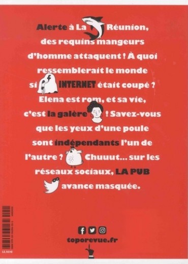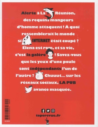 Alerte à la Réunion, des requins mangeurs d'homme attaquent ! A quoi ressemblerait le monde si internet était coupé ? Elena est Rom, et sa vie, c'est la galère ! Savez-vous que les yeux d'une poule sont indépendant l'un de l'autre ? Chut... sur les réseaux sociaux, la pub avance masquée.