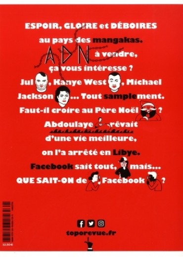 Espoir, gloire et déboires au pays des mangakas. ADN à vendre, ça vous intéresse ? Jul, Kanye West, Michael Jackson... Tout samplement. Faut-il croire au Père Noël ? Abdoulaye rêvait d'une vie meilleure, on l'a arrêté en Libye. Facebook sait tout, mais... Que sait-on de Facebook ?