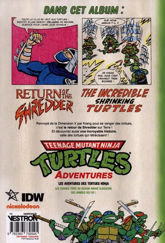 Teenage Mutant Ninja Turtles Adventures est une série de comics tirée du célèbre dessin animé TORTUES NINJA des années 90. Créée à la même époque par les studios Archie Comics, elle en reprend les personnages, leur univers et leurs codes. Elle débute avec ce premier album qui contient deux histoires complètes adaptées des épisodes télévisés Return of the Shredder et The Incredible Shrinking Turtles... mais par la suite, la série sera exclusivement composée d'histoires originales, non pas adaptées des épisodes diffusés à la télévision, mais créées spécialement pour les comics, entraînant les Tortues Ninja dans des aventures inédites et faisant intervenir une foule de nouveaux mutants ! Redécouvrez les bases de cet univers coloré avant de visiter de nouveaux horizons avec les tortues les plus célèbres du monde !