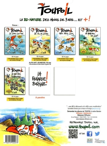 TOUPOIL est une série BD animalière jeunesse semi-réaliste. Le thème principal est la vie animale sauvage dans une nature de type européen. L'action se déroule dans notre monde contemporain. Le chien Toupoil est le guide du lecteur, invité à découvrir la Nature au travers de ses aventures. Un documentaire de quelques pages aborde en fin d'album la réalité de l'espèce animale rencontrée. Résumé : En sauvant un chaton lynx de la noyade, TOUPOIL se lie d'amitié avec RISSA la mère lynx et ses trois petits. A travers jeux et chasse, Toupoil va découvrir la vie des lynx jusqu'au jour où un chasseur tue Rissa. Avec ce qu'il sait et ce qu'il a appris, Toupoil va peu à peu remplacer, auprès des trois jeunes lynx, leur mère disparue et constituer ainsi une bien étrange famille...