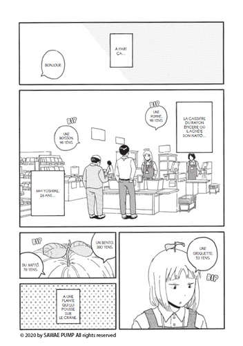 Une épouse qui vit enfermée nue chez elle, une gamine survoltée qui remonte le temps pour secouer les puces à l'ado déprimé qui lui sert d'aïeul, un catcheur qui ne se bat jamais sans ses lunettes, des plantes qui aiment se mêler aux humains, des grands-pères qui volent sans effort dans le ciel, des choses bizarres sur lesquels on tombe parfois la nuit, dans le noir... Virtuose de la tranche de vie, Pump Sawae sublime les mille et une petites choses qui surviennent tout au bout du quartier. Une nouvelle fois, l'auteur de Panda Detective Agency sait surprendre et émerveiller.