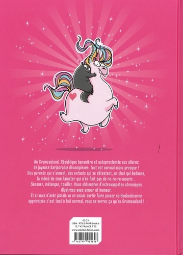 Au Grumeauland, République bananière et autoproclamée aux allures de joyeuses barjocracie décomplexée, tout est normal-mais-presque ! Des parents qui s'aiment, des enfants qui se détestent, un chat qui bedonne, la mémé de mon hamster qui n'en finit pas de re-re-re-mourir... Secouez, mélangez, touillez. Vous obtiendrez d'extravagantes chroniques illustrées avec amour et humour. Et si vous n'avez jamais vu un voisin sortir faire pisser sa Bouboulicorne apprivoisée c'est tout à fait normal, vous ne verrez ça qu'à Grumeauland !