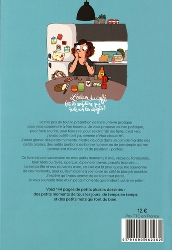 Je n'ai pas du tout la prétention de faire un livre pratique pour vous apprendre à être heureux. Je vous propose un livre poétique, pour faire sourire, pour faire rire, pour se dire "ah oui tiens, c'est vrai, j'avais oublié tout ça, comme c'était chouette". J'aime glaner des petits moments. Mettre de côté dans un coin de ma tête des petits plaisirs, des petits bonbons de bonne humeur ou de joie simple qui me permettent d'avancer et de positiver - parfois. Ce livre est une succession de mes petits moments à moi, vécus ou fantasmés, bien réels ou rêvés, aperçus, à peine entrevus, passés trop vite .... Le temps file et nos souvenirs avec, ce livre est là pour que je me souvienne de ces moments, pour qu'ils m'aident à voir la vie du côté le plus joli possible. J'espère qu'il vous permettra de faire tout pareil. Je vous souhaite mille et un petits moments qui rendront votre vie jolie ! Voici 144 pages de petits plaisirs dessinés : des petits moments de tous les jours, de temps en temps et des petits mots qui font du bien.
