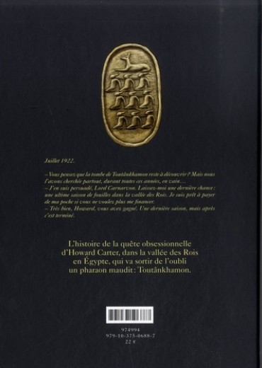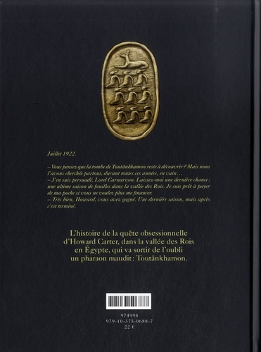 Juillet 1922. Vous pensez que la tombe de Toutdnkhamon reste à découvrir ? Mais nous l'avons cherchée partout, durant toutes ces années, en vain... J'en suis persuadé, Lord Carnarvon. Laissez-moi une dernière chance : une ultime saison de fouilles dans la vallée des Rois. Je surs prêt à payer de ma poche si vous ne voulez plus me financer. Très bien, Howard, vous avez gagné. Une dernière saison, mais après c'est terminé. L'histoire de la quête obsessionnelle d'Howard Carter, dans la vallée des Rois en Egypte, qui va sortir de l'oubli un pharaon maudit : Toutânkhamon.