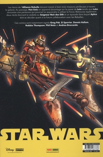 Les héros de l'Alliante Rebelle doivent mener àbien trois missions périlleuses à travers la galaxie. Au passage, Han Solo en apprend davantage sur le passé de Leia tendis que Luke rencontre une personne qui pourrait lui apprendre à utiliser la Force. Retrouvez également deux récits donnant la vedette, au Seigneur Noir des Sith et un épisode dans lequel Aphra doit se décider quant à sa future collaboration avec les Rebelles. Ces comics sont notamment signés Greg Pak, Si Spurrier, Dennis Hallum, Robbie Thompson, Phil Noto et Andrea Broccardo.