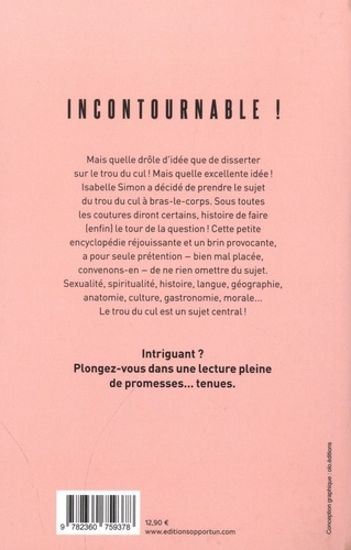 Un essai sur le trou du cul, sérieux ? ! Une petite encyclopédie qui a la seule prétention - bien mal placée, je vous l'accorde ! - de se montrer exhaustive en la matière : sexualité, spiritualité, histoire, société, géographie, anatomie, arts, cuisine, imaginaires, morale... Pour faire (enfin) le tour de la question ! Une première éditoriale Quelle drôle d'idée que de disserter sur le trou du cul ! Mais quelle bonne idée ! Isabelle Simon propose de découvrir le trou du cul sous toutes les coutures et toutes les acceptions : anatomique bien entendu, mais aussi géographique, spirituelle, historique, sociale, géographique, morale, lexicale, gastronomique même. Vous voulez en savoir plus ? Il vous suffit de vous plonger dans cette lecture pleine de promesses... tenues. Un livre détonant et étonnant !
