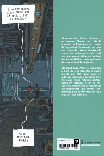 Mouhamouda, Omar, Jeannette ou encore Claude ont pris la "route de l'aventure", comme ils l'appellent. En chemin, certains ont connu la prison, d'autres la traite, les violences... mais c'est sur une embarcation de fortune lancée en Méditerranée que leurs destins se sont liés à jamais. Eté 2022, Lucas Vallerie embarque à bord du Geo Barents, le navire affrété par MSF pour venir en aide aux naufragés en haute mer. Au cours d'une rotation particulièrement intense, il fait la rencontre marquante de personnalités exceptionnelles qui rêvent simplement d'un avenir meilleur, et a recueilli leurs histoires.