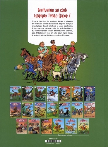 Séances de mise en forme, toilettage, promenades dans les bois. Eh oui, la plus belle conquête du cheval, c'est bien l'homme ! Ce ne sont pas les personnages hauts en couleur de cette BD qui le démentiront. Souvenez-vous, vous les avez sûrement déjà croisés. Il y a Monique, la monitrice du club hippique, pas très féminine, râleuse mais sympa ; son frimeur de fils Roméo, qui rêve d'être un grand champion de concours hippique ; Maud, amoureuse inconditionnelle des équidés, même quand il y a une litière à changer ; Céline qui, elle, préfère les cajoler que les monter ; et Bébert, l'emblématique palefrenier qui a toujours vécu "dans" les chevaux. Des chevaux fièrement représentés par Mascotte, le poney facétieux, Blanche Neige la jolie jument ou Ramsès le crack. Amoureux des chevaux, pas d'hésitation ! Tous en selle pour Triple Galop, la seule et unique BD très à cheval sur l'humour !