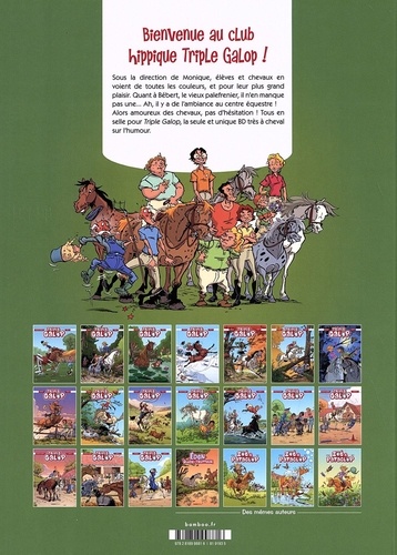 Bienvenue au club hippique Triple Galop ! Sous la direction de Monique, élèves et chevaux en voient de toutes les couleurs, et pour leur plus grand plaisir. Quant à Bébert, le vieux palefrenier, il n'en manque pas une... Ah, il y a de l'ambiance au centre équestre ! Alors amoureux des chevaux, pas d'hésitation ! Tous en selle pour Triple Galop, la seule et unique BD très à cheval sur l'humour.