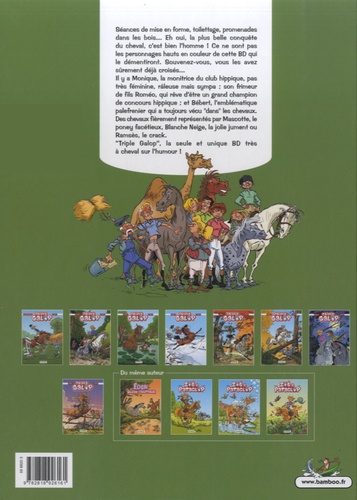 Séances de mise en forme, toilettage, promenades dans les bois... Eh oui, la plus belle conquête du cheval, c'est bien l'homme ! Ce ne sont pas les personnages hauts en couleur de cette BD qui le démentiront. Souvenez-vous, vous les avez sûrement déjà croisés... Il y a Monique, la monitrice du club hippique, pas très féminine, râleuse mais sympa ; son frimeur de fils Roméo, qui rêve d'être un grand champion de concours hippique ; et Bébert, l'emblématique palefrenier qui a toujours vécu "dans" les chevaux. Des chevaux fièrement représentés par Mascotte, le poney facétieux, Blanche Neige, la jolie jument ou Ramsès, le crack. «Triple Galop», la seule et unique BD très à cheval sur l'humour !