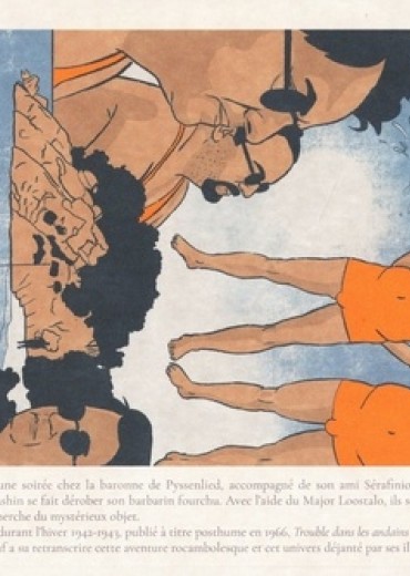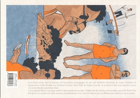 Lors d'une soirée chez la baronne de Pyssenlied, accompagné de son ami Sérafinio Alvaraide, le comte Adelphin de Beaumashin se fait dérober son barbarin fourchu. Avec l'aide du Major Loostalo, ils se lancent dans une enquête cocasse à la recherche du mystérieux objet. Conçu durant l'hiver 1942-1943, publié à titre posthume en 1966, Trouble dans les andains est le premier roman de Boris Vian. Penograf a su retranscrire cette aventure rocambolesque et cet univers déjanté par ses illustrations colorées et percutantes.