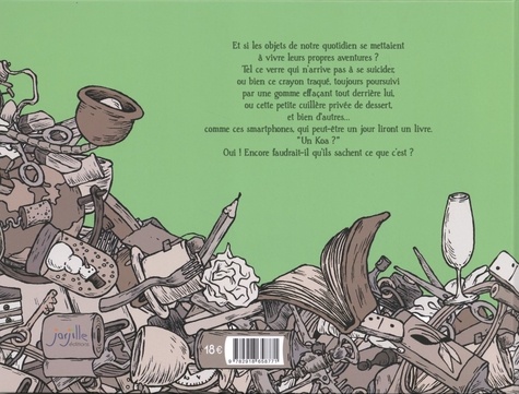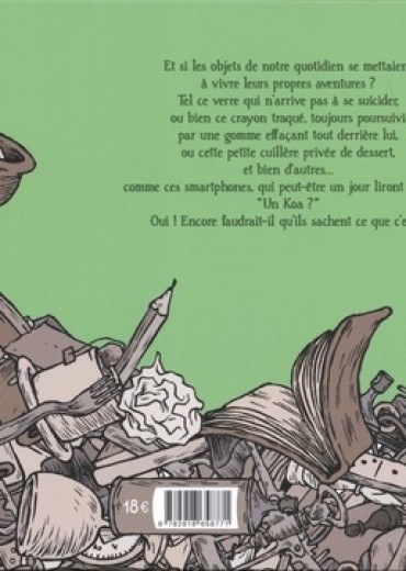 Et si les objets de notre quotidien se mettaient à vivre leurs propres aventures ? Tel ce verre qui n'arrive pas à se suicider, ou bien ce crayon traqué, toujours poursuivi par une gomme effaçant tout derrière lui, ou cette petite cuillère privée de dessert, et bien d'autres... Comme ces smartphones, qui peut-être un jour liront un livre. "Un Koa ? " Oui ! Encore faudrait-il qu'ils sachent ce que c'est ?