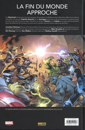 Les Illuminati tentent par tous les moyens d'empêcher le Multivers de s'effondrer. Mais leurs actions radicales ont poussé Captain America et les Avengers dans leurs retranchements. La guerre entre les héros est désormais ouverte ! Pendant ce temps, Thanos et sa Cabale sont peut-être la dernière ligne de défense de l'univers. A moins qu'il n'existe d'autres héros prêts à se sacrifier... Jonathan Hickman (House of X, Secret Wars) fusionne ses séries New Avengers et Avengers pour un grand final à découvrir en deux tomes. Il est accompagné par Mike Deodato Jr (Savage Avengers), Jim Cheung (Infinity), Kev Walker (Docteur Aphra) et Stefano Caselli (Marauders).