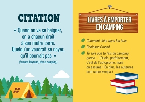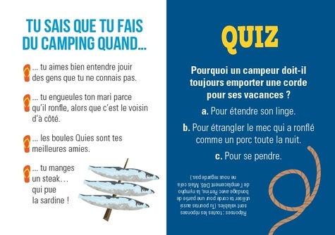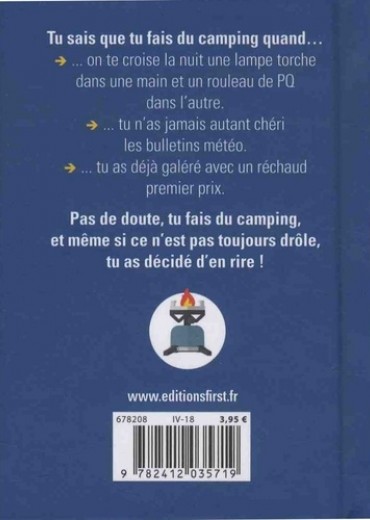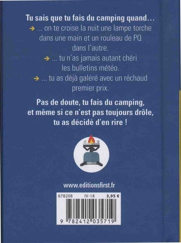 Tu sais que tu fais du camping quand... on te croise la nuit une lampe torche dans une main et un rouleau de PQ dans l'autre ; tu n'as jamais autant chéri les bulletins météo ; tu as déjà galéré avec un réchaud premier prix. Pas de doute, tu fais du camping, et même si ce n'est pas toujours drôle, tu as décidé d'en rire !
