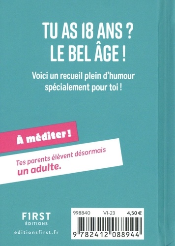 Un petit livre plein d'humour pour fêter dignement sa majorité ! Il y a 18 centimètres de poussière sous ton lit (un cm par an). Tu trouves que les jeunes de 17 ans ont vraiment l'air de gamins mal finis. Tu sais super bien cuisiner. Surtout les pâtes au beurre et les radis en rondelles. Tu pleures encore devant Le Roi lion, mais en faisant du baby-sitting. Tu n'as plus que 2 coques pour ton téléphone (vu que tu viens de jeter les 50 que tu avais achetés entre tes 16 et 17 ans et qui étaient vraiment des coques de bébé). Pas de doute, tu as 18 ans, ce livre est fait pour toi !