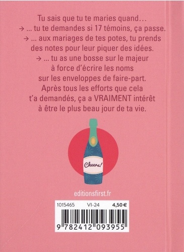 Tu sais que tu te maries quand... - ... tu te demandes si 17 témoins, ça passe. - ... aux mariages de tes potes, tu prends des notes pour leur piquer des idées. - ... tu as une bosse sur le majeur à force d'écrire les noms sur les enveloppes de faire-part. Après tous les efforts que cela t'a demandés, ça a VRAIMENT intérêt à être le plus beau jour de ta vie.