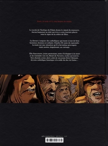 Paris, 24 août 1572, cinq heures du matin. Le tocsin de l'horloge du Palais donne le signal du massacre. Aucun huguenot ne doit survivre à cette journée placée sous le signe de la colère de Dieu. La fureur s'empare des catholiques qui tuent à tour de bras hommes, femmes et enfants. Charles IX tente de reprendre la main sur une situation qu'il a lui-même provoquée mais assiste, impuissant, au carnage. Elie Sauveterre, jeune protestant, tente d'échapper à la mort et de rejoindre son roi, Henri de Navarre, reclus au Louvre. Son chemin croise alors celui de son jeune frère Clément, devenu catholique fanatique à la solde du duc de Guise...
