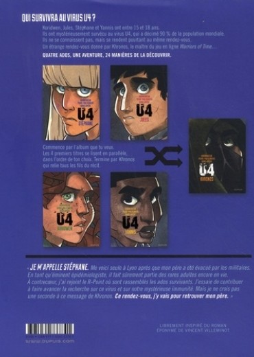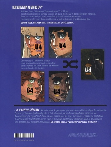 "Je m'appelle Stéphane. Me voici seule à Lyon après que mon père a été évacué par les militaires. En tant qu'éminent épidémiologiste, il fait sûrement partie des rares adultes encore en vie. A contrecoeur, j'ai rejoint le R-Point où sont rassemblés les ados survivants. J'essaie de contribuer à faire avancer la recherche sur ce virus et sur notre mystérieuse immunité. Mais je ne crois pas une seconde à ce message de Khronos. Ce rendez-vous, j'y vais pour retrouver mon père."