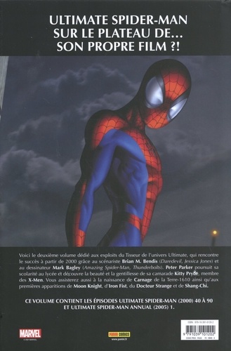 Voici le deuxième volume dédié aux exploits du Tisseur de l'univers Ultimate, qui rencontre le succès à partir de 2000 grâce au scénariste Brian M. Bendis (Daredevil, Jessica Jones) et au dessinateur Mark Bagley (Amazing Spider-Man, Thunderbolts). Peter Parker poursuit sa scolarité au lycée et découvre la beauté et la gentillesse de sa camarade Kitty Pryde, membre des X-Men. Vous assisterez aussi à la naissance de Carnage de la Terre-1610 ainsi qu'aux premières apparitions de Moon Knight, d'Iran Fist, du Docteur Strange et de Shang-Chi.