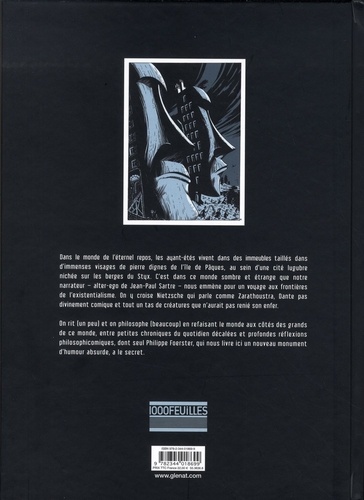 Humour noir mais pensée lumineuse ! Dans le monde de l'éternel repos, les ayant-étés vivent dans immeubles taillés dans d'immenses visages de pierre dignes de l'île de Pâques, au sein d'une cité lugubre nichée sur les berges du Styx. C'est dans ce monde sombre et étrange que notre narrateur - le lecteur reconnaîtra sans peine l'alter-ego de Jean-Paul Sartre - nous emmène pour un voyage aux frontières des idées et de l'existentialisme. On y croise Nietzsche qui parle comme Zarathoustra, Dante pas vraiment divinement comique et tout un tas de créatures que n'aurait pas renié son enfer. On rit (un peu) et on philosophe (beaucoup) en refaisant le monde aux côtés des grands de ce monde, entre petites chroniques du quotidien décalées et profondes réflexions philosophicomiques. Auteur génial mais injustement méconnu, l'immense Philippe Foerster (Le Confesseur sauvage) nous livre un nouveau monument de cet humour absurde dont lui seul a le secret. Aussi expressionniste par le dessin qu'existentialiste par la pensée, il s'amuse de la comédie humaine et nous permet de rire de nous-mêmes.