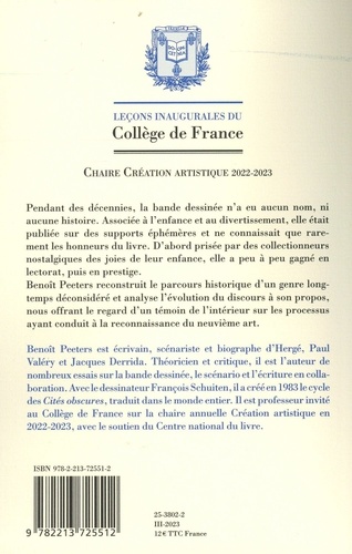 Chaire Création artistique 2022-2023 Pendant des décennies, la bande dessinée n'a eu aucun nom, ni aucune histoire. Associée à l'enfance et au divertissement, elle était publiée sur des supports éphémères et ne connaissait que rarement les honneurs du livre. D'abord prisé par des collectionneurs nostalgiques des joies de leur enfance, elle a peu à peu gagné en lectorat, puis en prestige. Benoît Peeters reconstruit le parcours historique d'un genre longtemps déconsidéré et analyse l'évolution du discours à son propos, nous offrant le regard d'un témoin de l'intérieur sur les processus ayant conduit à la reconnaissance du neuvième art.