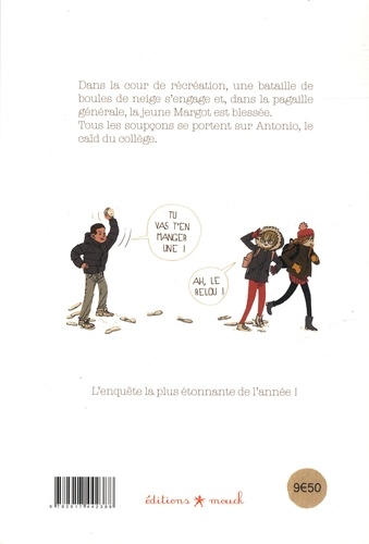 Dans la cour de récréation, une bataille de boules de neige s'engage et, dans la pagaille générale, la jeune Margot est blessée. Tous les soupçons se portent sur Antonio, le caïd du collège... L'enquête promet d'être étonnante. Graines d'ados : Les ouvrages abordent avec humour, mais toujours de façon très juste, les réalités auxquelles sont confrontés les préados : portable, Internet, argent de poche, popularité, puberté, amitié, premier amour, etc.