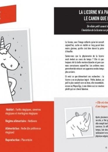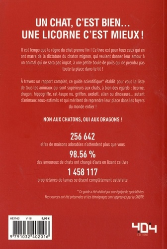 L'étude qui met enfin les chats et les chiens au placard : adoptez une licorne ! Les chats, les chiens, les hamsters, c'est bien ! Mais, franchement, un dragon, une licorne, une loutre ou un hippogriffe, c'est mieux, non ? Un guide complet et très documenté sur ces animaux dont on ne parle pas assez, mais qui pourtant peuplent l'univers du Geek qui sommeille en nous. Esprit WTF, tests, graphiques, quiz, pourcentages, tout pour choisir l'animal de compagnie geek qui nous correspond !