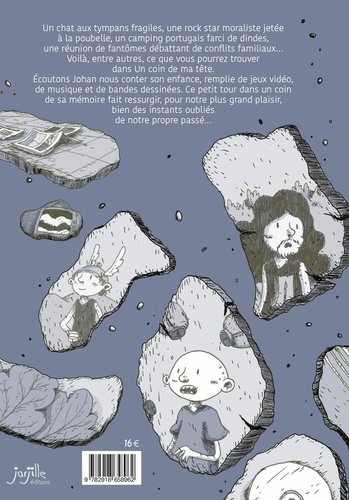 Un chat aux tympans fragiles, une rock star moraliste jetée à la poubelle, un camping portugais farci de dindes, une réunion de fantômes débattant de conflits familiaux... Voilà, entre autres, ce que vous pourrez trouver dans Un coin de ma tête. Ecoutons Johan nous conter son enfance, remplie de jeux vidéo, de musique et de bandes dessinées. Ce petit tour dans un coin de sa mémoire fait ressurgir, pour notre plus grand plaisir, bien des instants oubliés de notre propre passé...