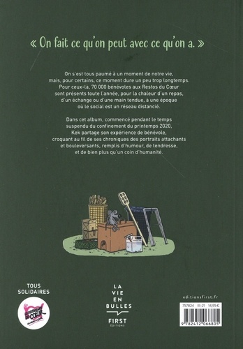 Les chroniques BD d'un bénévole aux Restos du Coeur . La totalité des droits d'auteur et de la marge de l'éditeur est reversée à l'association Les Restos du Coeur. On s'est tous paumé à un moment de notre vie, mais, pour certains, ce moment dure un peu trop longtemps. Pour ceux-là, 70 000 bénévoles aux Restos du Coeur sont présents toute l'année, pour la chaleur d'un repas, d'un échange ou d'une main tendue, à une époque où le social est un réseau distancié. Dans cet album, commencé pendant le temps suspendu du confinement du printemps 2020, Kek partage son expérience de bénévole, croquant au fil de ses chroniques des portraits attachants et bouleversants, remplis d'humour, de tendresse, et de bien plus qu'un coin d'humanité.