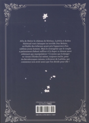 Afin de libérer le château de Sérénas, Laëtitia et Erden Halstead vont s'attaquer au terrible Duc Belaire, un Diable des richesses ayant pris l'apparence d'un sublime jeune homme. Mais le stratagème que le couple a patiemment élaboré suffira-t-il à duper ce démon aussi séduisant que manipulateur ? A moins que le danger ne vienne d'Erden lui-même, toujours enclin, pour de chevaleresques raisons, à divorcer de Laëtitia, qui commence à en avoir assez que l'on décide pour elle ! - - 4 "K actory"etun collection de Edit ons [VEGAI II III II ISBN 978-2 3795 0839-4 - 0D07