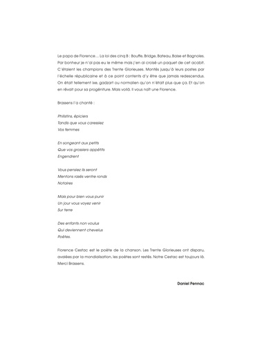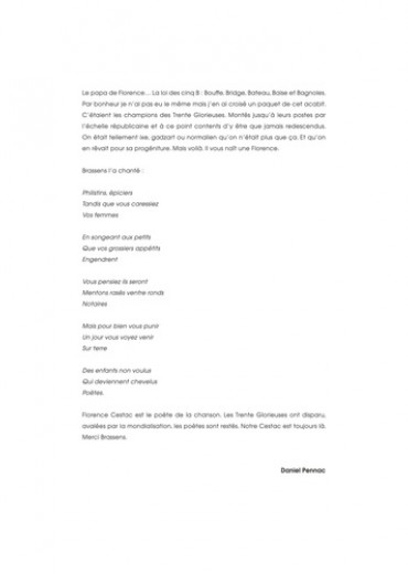 "Si je me suis marié, c'est pour me faire servir ! " Ainsi commence avec fracas cette nouvelle bande dessinée de Florence Cestac. Avec sa faconde habituelle, elle y raconte son père, homme d'une époque (avant 68...), d'un milieu (la petite bourgeoisie de province), et leurs relations tumultueuses. Entre une fille déjà artiste et rebelle à toute forme d'autorité, et un père colérique, pour qui dire "je t'aime" est un signe de faiblesse, la vie n'a pas été un long fleuve tranquille.