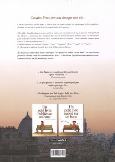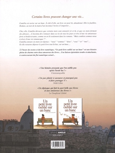 Camélia est assise sur un banc. A côté d'elle, un livre est posé là, abandonné. Elle le feuillète. Dedans, un mot de la main d'un inconnu l'invite à l'emporter... Chez elle, Camélia découvre que certains mots sont entourés ici et là, et que ces mots forment des phrases... L'inconnu dit s'ennuyer dans sa vie de tous les jours et rêve d'une vie amoureuse forte et bouleversante, comme on en lit seulement dans les romans. "Mais combien sommes-nous à rêver d'une vie romanesque?". Camélia entoure six mots en réponse : "nous" "sommes" "deux", "vous" "et" "moi"... Et elle retourne déposer le petit livre tout là-bas, sur un banc... A l'heure des textos et du livre numérique, "Un petit livre oublié sur un banc" est une histoire pleine de charme entre deux amoureux des livres... Une liaison épistolaire tendre et attachante, à contrecourant du flot numérique actuel...