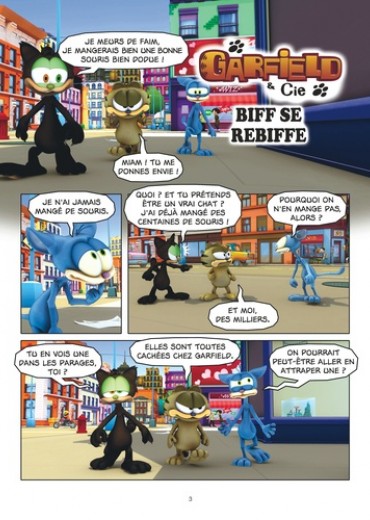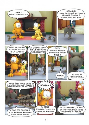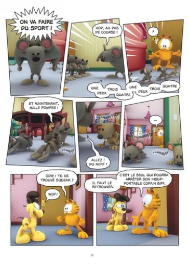 Une, deux ! Une, deux ! Biff entraîne les souris tel un général d'armée. Sûr de lui, il défie Bruno en l'attrapant par l'orteil et en le faisant tournoyer. On dirait le lancer de marteau aux Jeux olympiques ! Les souris applaudissent. Garfield s'amuse beaucoup à les regarder. Quel merveilleux après-midi ! Tout est parfait jusqu'au moment où Biff décide qu'il doit s'entraîner lui aussi. Garfield doit trouver le moyen de détourner son attention : tout cela devient beaucoup trop sain pour lui !