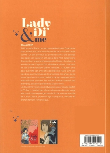 Une icône au destin tragique 31 août 1997. 1h16 du matin. Paris. Les secours mettent plus d'une heure pour extraire la princesse Diana de sa voiture écrasée contre l'un des poteaux du Pont de l'Alma. Elle décède peu après son transfert à l'hôpital de la Salpêtrière. Sous le choc, la jeune photo-reporter Marie-Linh cherche à comprendre. S'agit-il d'un véritable accident ? Certains de ses clichés laissent planer le doute... D'autant que, pour avoir été son amie et sa confidente, Marie-Linh sait très bien que l'attitude de la princesse, les affres de sa vie privée tout comme certains de ses engagements médiatiques (contre les mines anti-personnel par exemple), posaient problème à la couronne. Le deuxième volume du diptyque de Jean-Claude Bartoll et Yishan Li prend des allures de roman d'espionnage alors qu'il nous replonge dans la fin de vie tourmentée de Lady Diana...