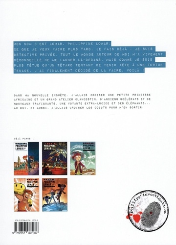 Mon nom c'est Lomar, Philippine Lomar. Ce que je veux faire plus tard, je fais déjà : je suis détective privée. Tout le monde autour de moi m'a vivement déconseillé de me lancer là-dedans, mais comme je suis plus têtue qu'un têtard tentant de tenir tête à une tortue tenace, j'ai finalement décidé de la faire, voilà ! Dans ma nouvelle enquête, j'allais croiser une petite princesse africaine et un grand atelier clandestin, d'anciens scélérats et de nouveaux trafiquants, une voyante extra-lucide et des éléphants... Ah oui, et aussi, j'allais croiser les doigts pour m'en sortir.