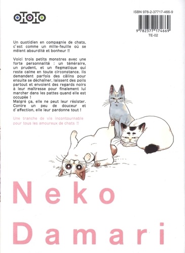 Un quotidien en compagnie de chats, c'est comme un mille-feuille où se mêlent absurdité et bonheur !! Voici trois petits monstres avec une forte personnalité : un téméraire, un prudent, et un flegmatique qui reste calme en toute circonstance. Ils demandent parfois des câlins pour ensuite se déchaîner, laissent des poils partout et envoient des regards noirs à leur maîtresse pour finalement lui marcher dans les pattes quand elle est occupée ! Malgré ça, elle ne peut leur résister. Contre un peu de douceur et d'affection, elle leur pardonne tout !