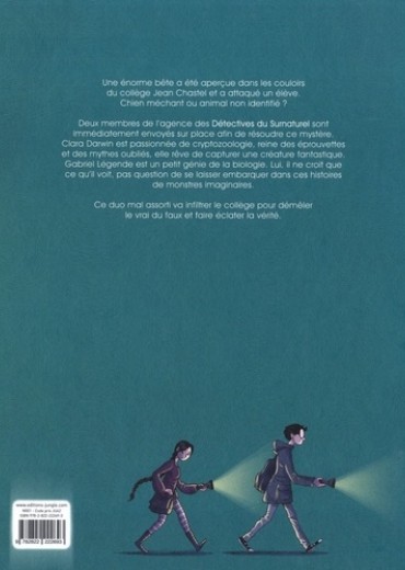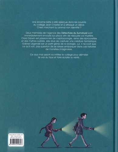 Une énorme bête a été aperçue dans les couloirs du collège Jean Chastel et a attaqué un élève. Chien méchant ou animal non identifié ? Deux membres de l'agence des Détectives du Surnaturel sont immédiatement envoyés sur place afin de résoudre ce mystère. Clara Darwin est passionnée de cryptozoologie, reine des éprouvettes et des mythes oubliés, elle rêve de capturer une créature fantastique. Gabriel Légende est un petit génie de la biologie. Lui, il ne croit que ce qu'il voit, pas question de se laisser embarquer dans ces histoires de monstres imaginaires. Ce duo mal assorti va infiltrer le collège pour démêler le vrai du faux et faire éclater la vérité.