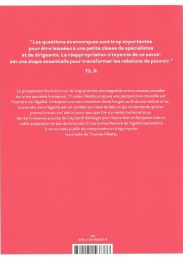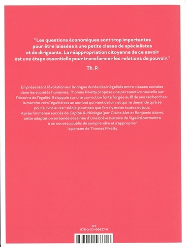 " Les questions économiques sont trop importantes pour être laissées à une petite classe de spécialistes et de dirigeants. La réappropriation citoyenne de ce savoir est une étape essentielle pour transformer les relations de pouvoir. " Th. P. En présentant l'évolution sur la longue durée des inégalités entre classes sociales dans les sociétés humaines, Thomas Piketty propose une perspective nouvelle sur l'histoire de l'égalité. Il s'appuie sur une conviction forte forgée au fil de ses recherches : la marche vers l'égalité est un combat qui vient de loin, et qui ne demande qu'à se poursuivre au xxie siècle, pour peu que l'on s'y mette toutes et tous. Après l'immense succès de Capital & Idéologie (par Claire Alet et Benjamin Adam), cette adaptation en bande dessinée d'Une brève histoire de l'égalité permettra à un nouveau public de comprendre et s'approprier la pensée de Thomas Piketty.