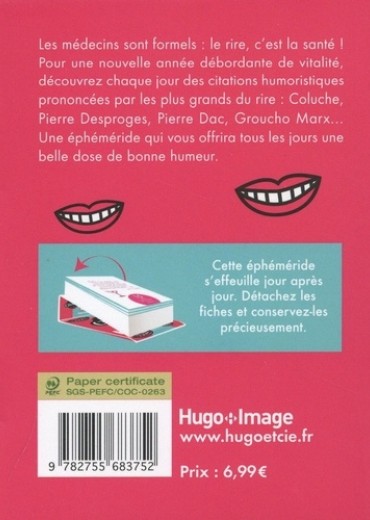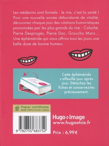 Les médecins sont formels : le rire, c'est la santé ! Pour une nouvelle année débordante de vitalité, découvrez chaque jour des citations humoristiques prononcées par les plus grands du rire : Coluche, Pierre Desproges, Pierre Dac, Groucho Marx... Une éphéméride qui vous offrira tous les jours une belle dose de bonne humeur.