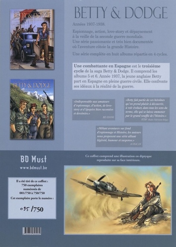 Espionnage, action, love-story et dépaysement à la veille de la seconde guerre mondiale. Une série passionnante et très bien documentée où l'aventure côtoie la grande Histoire. Une série complète en huit albums répartis en 4 cycles. Une combattante en Espagne est le troisième cycle de la saga Betty & Dodge. Il comprend les albums 5 et 6. Année 1937, la jeune anglaise Betty part en Espagne en pleine guerre civile. Elle confronte ses idéaux à la réalité de la guerre.