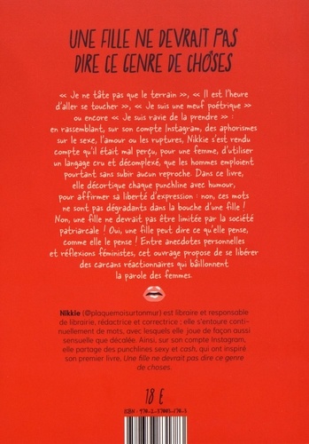 " Je ne tâte pas due le terrain ", " Il est l'heure d'aller se toucher ", " Je suis une meuf poétrique" ou encore " Je suis ravie de la prendre " : en rassemblant, sur son compte Instagram, des aphorismes sur le sexe, l'amour ou les ruptures, Nikkie s'est rendu compte qu'il était mal perçu, pour une femme, d'utiliser un langage cru et décomplexé, que les hommes emploient pourtant sans subir aucun reproche. Dans ce livre, elle décortique chaque punchline avec humour, pour affirmer sa liberté d'expression : non, ces mots ne sont pas dégradants dans la bouche d'une fille ! Non, une fille ne devrait pas être limitée par la société patriarcale ! Oui, une fille peut dire ce qu'elle pense, comme elle le pense ! Entre anecdotes personnelles et réflexions féministes, cet ouvrage propose de se libérer des carcans réactionnaires qui bâillonnent la parole des femmes.