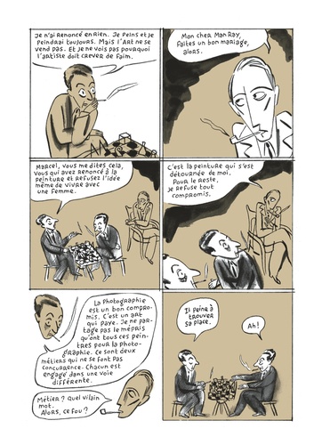 On connaît Philippe Dupuy pour son travail d'auteur de bande dessinée, notamment aux côtés de son acolyte Charles Berbérian. On sait moins, en revanche, que le dessinateur est un grand amateur d'art ; qu'il fut l'élève, sur les bancs des Arts Déco, du célèbre critique d'art Pierre Cabanne ; qu'il n'a depuis cessé de nourrir sur le sujet une réflexion passionnée. "Une histoire de l'art", entamée en 2017 avec le plus grand leporello de l'histoire de la bande dessinée (plus de 23 mètres recto verso), continue ainsi de se dérouler dans ce deuxième volume, Peindre, qui nous permet d'en apprendre plus sur le rapport de Philippe Dupuy aux oeuvres et aux artistes. Au fil du parcours personnel de Man Ray, entre peinture et photographie, qui croisera notamment Marcel Duchamp, et surtout pour le pur amour de l'art, nous sommes conviés à déambuler dans le paysage artistique de ce XXe siècle et à sauter d'expositions en ateliers. De la toile à la boîte noire, de la France aux Etas-Unis, comme entre deux pop-ups originaux conçus par Jean-Marc Fiess, nous poursuivons une déambulation artistique unique en son genre. Un voyage ludique et didactique au pays de l'art contemporain !