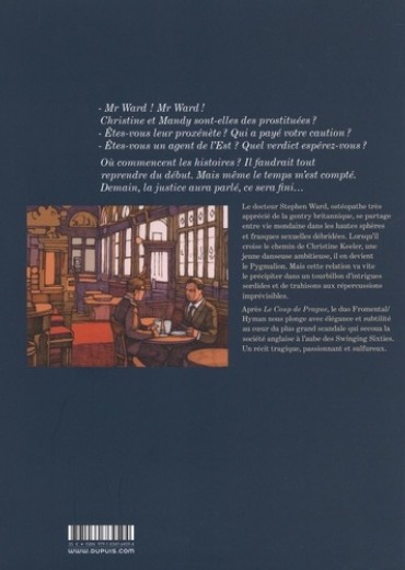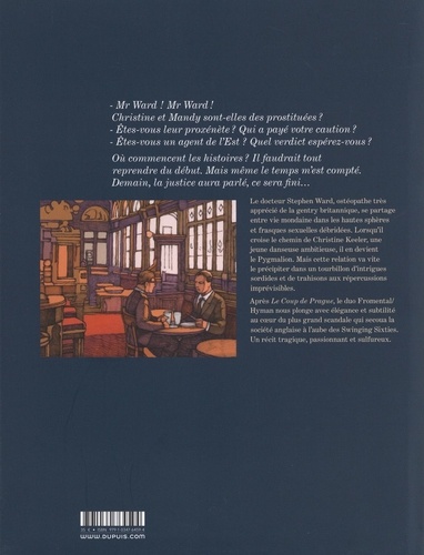 Londres, dans les années 60. Le docteur Stephen Ward, ostéopathe dont les talents lui valent l'affection de nombreux notables, partage ses loisirs entre réceptions mondaines et parties fines... Lorsqu'il croise Christine, une jeune danseuse ambitieuse, il en devient le Pygmalion, lui faisant rencontrer des hommes aussi importants (et sensibles à son charme) qu'un espion russe ou encore le ministre de la Guerre anglais, John Profumo... L'affaire Profumo, avec ses relents d'espionnage international et de coucheries mondaines, fut le plus grand scandale de la société anglaise des sixties. Miles Hyman et Jean-Luc Fromental, après Le Coup de Prague, se révèlent parfaits pour lui redonner vie, dépeignant avec une égale réussite l'esthétisme guindé d'une Londres bourgeoise et la beauté des corps cherchant à s'affranchir de cette rigidité. Un grand livre ? dans la tradition d'un John Le Carré ? pour une énorme affaire...